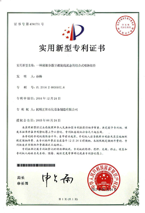 一種旋轉床反應器專利證書